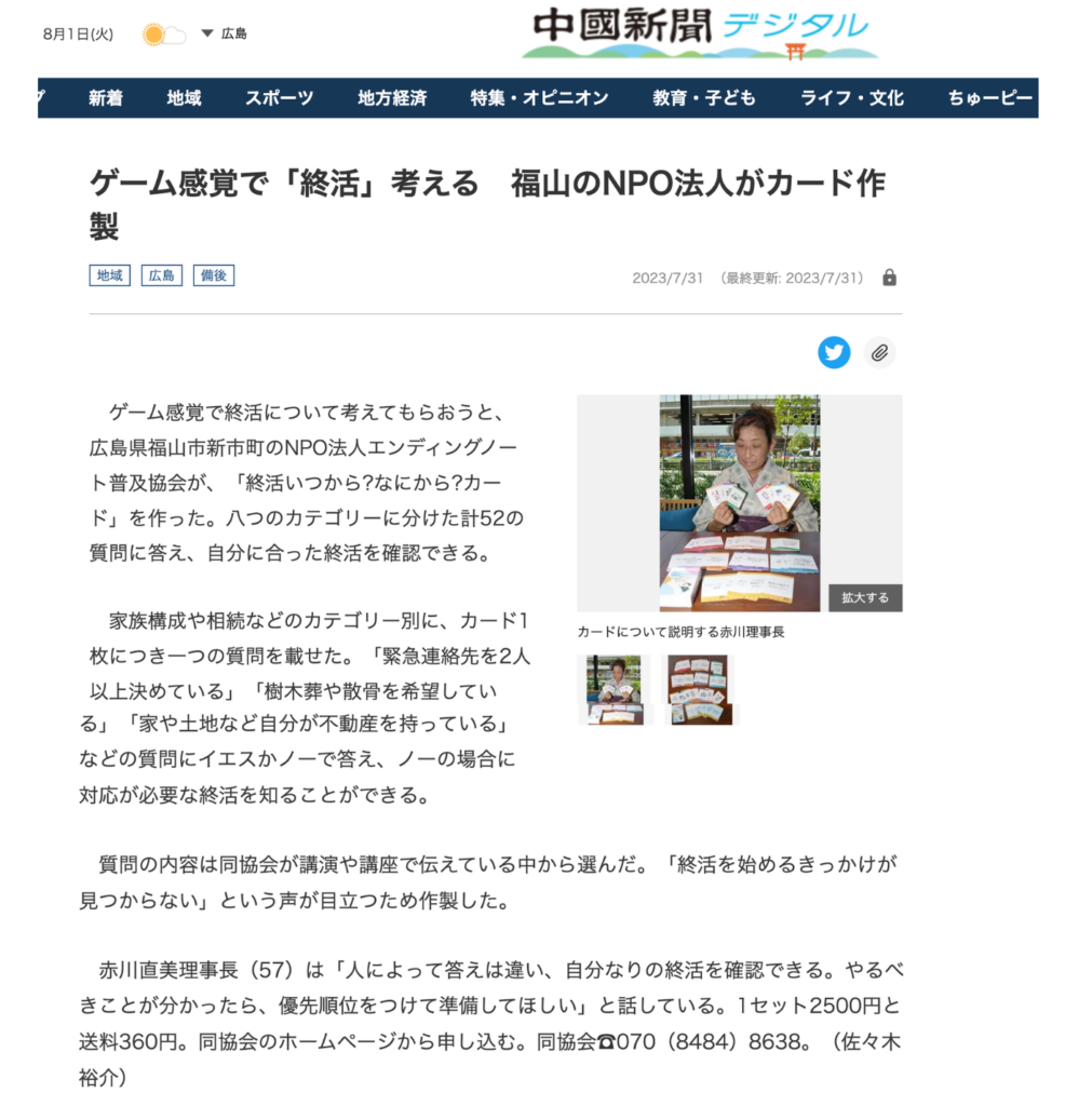 終活いつから?なにから?カードが中国新聞で紹介されました