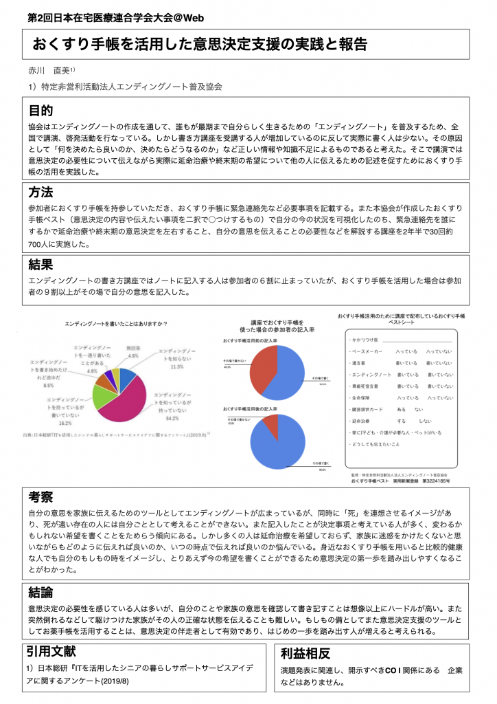また、2020年6月27日 (土)、28日(日)に開催された第2回日本在宅医療連合学会大会では「お薬手帳を活用した意思決定支援の実践と報告」としてポスター発表をさせていただきました。